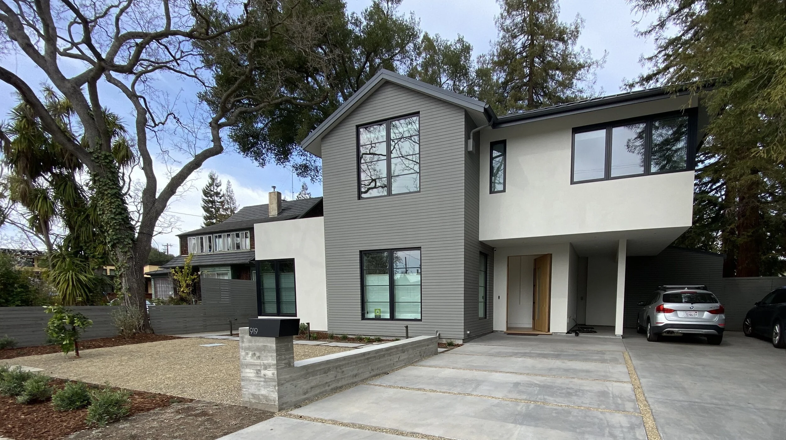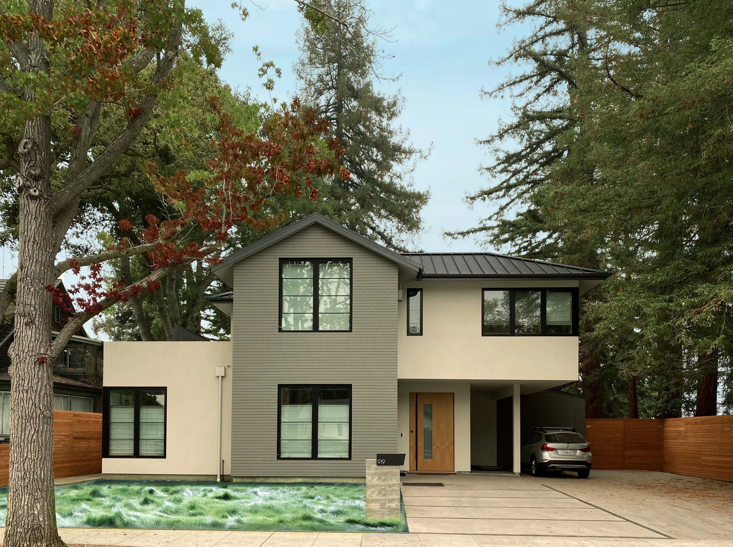 The open floor plan incorporates Vastu Shastra principles, lending a clean and modern design to the interior. An innovative screening solution provides privacy to the second-story balcony and allows for views of the landscaped front yard.